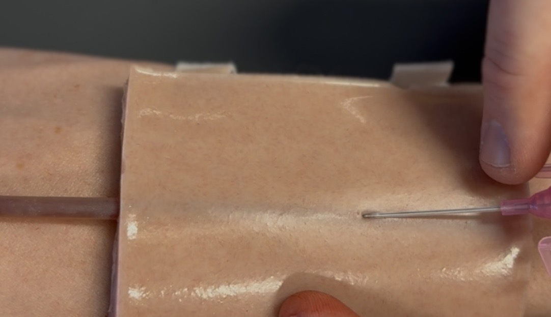Den artificiella venen kan fyllas och trycksättas med medföljande spruta för att simulera realistiskt blodsvar vid kateterisering.